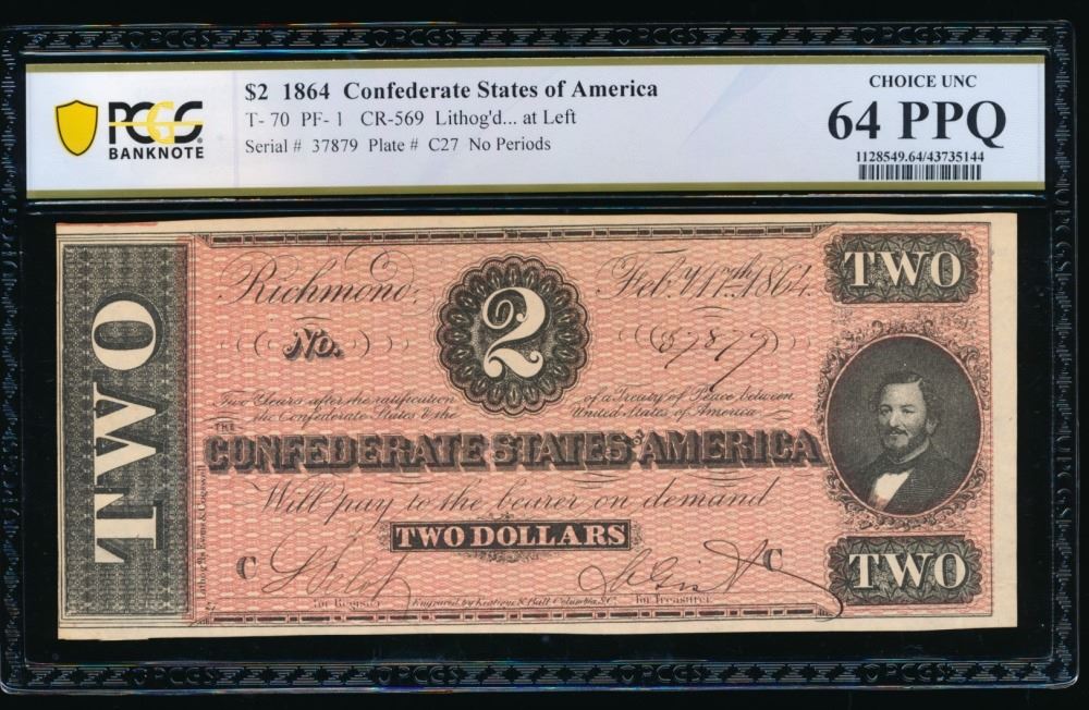 One 1864 $2 T-70 Confederate PCGS 64PPQ.