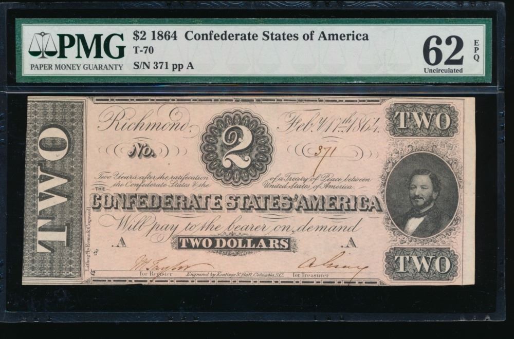 One 1864 $2 T-70 Confederate PMG 62EPQ.