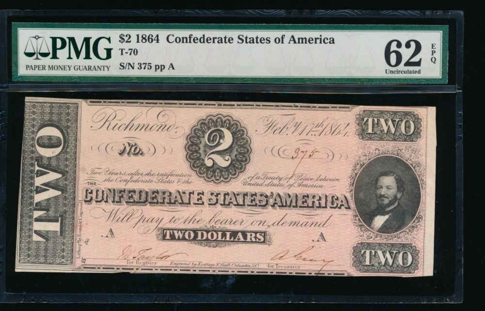 One 1864 $2 T-70 Confederate PMG 62EPQ.