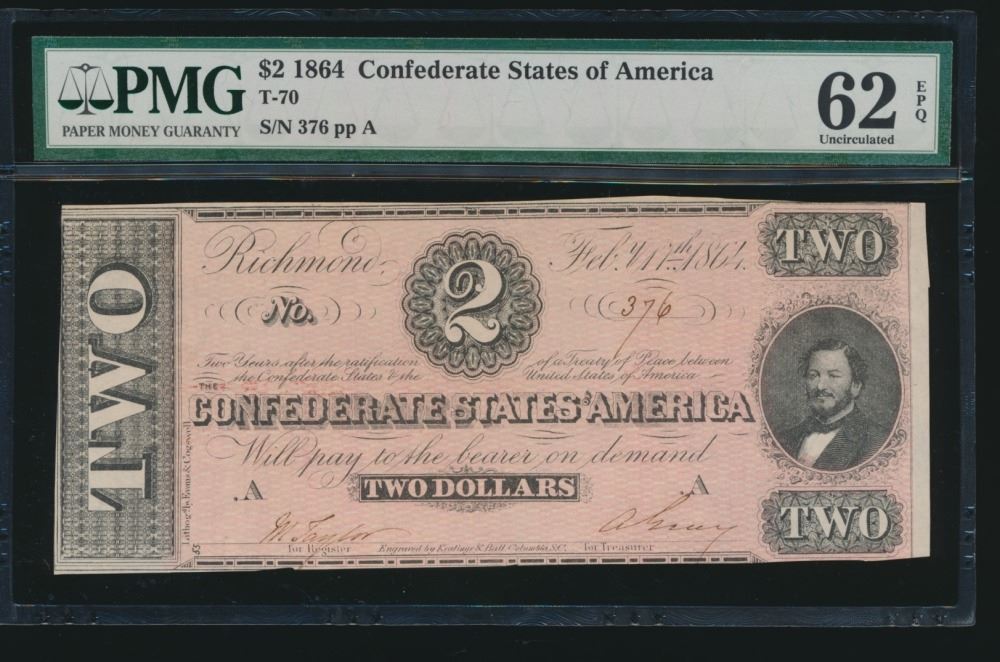 One 1864 $2 T-70 Confederate PMG 62EPQ.