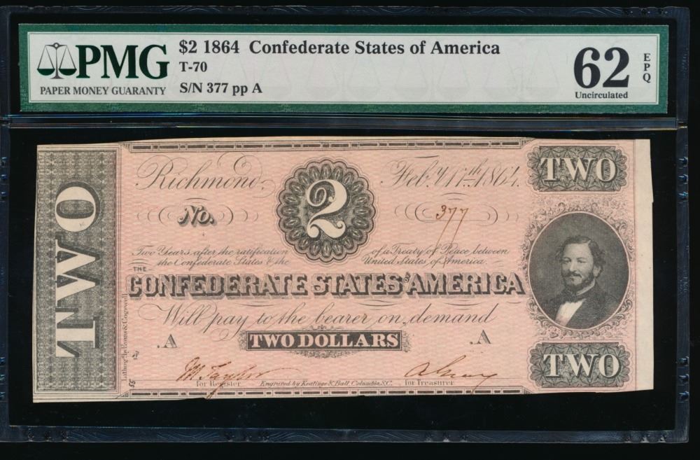 One 1864 $2 T-70 Confederate PMG 62EPQ.