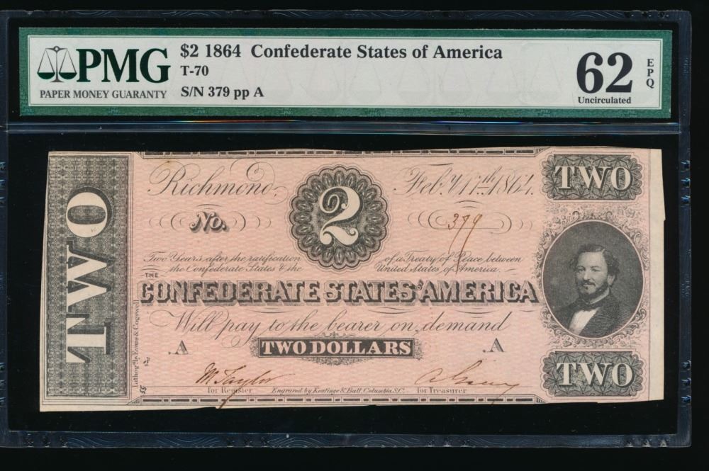 One 1864 $2 T-70 Confederate PMG 62EPQ.