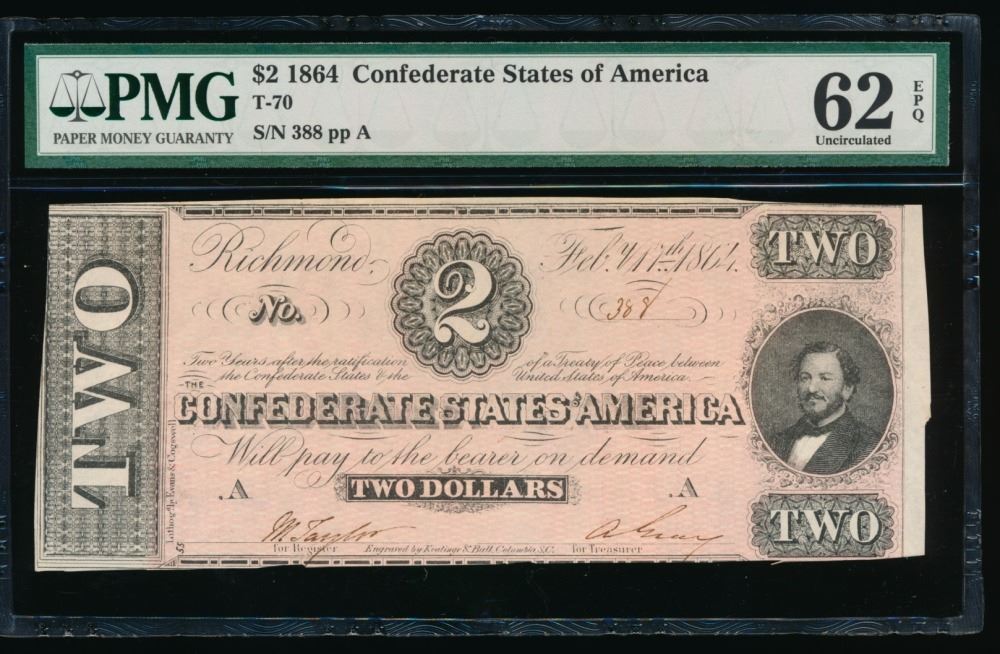 One 1864 $2 T-70 Confederate PMG 62EPQ.