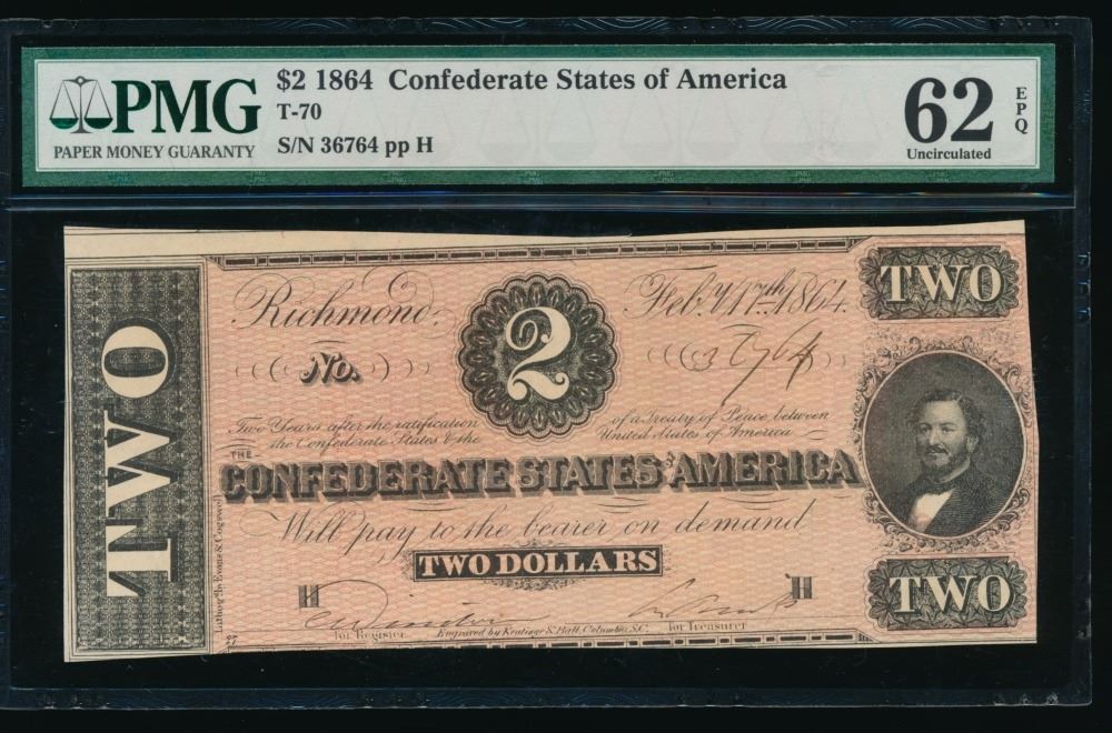 One 1864 $2 T-70 Confederate PMG 62EPQ.