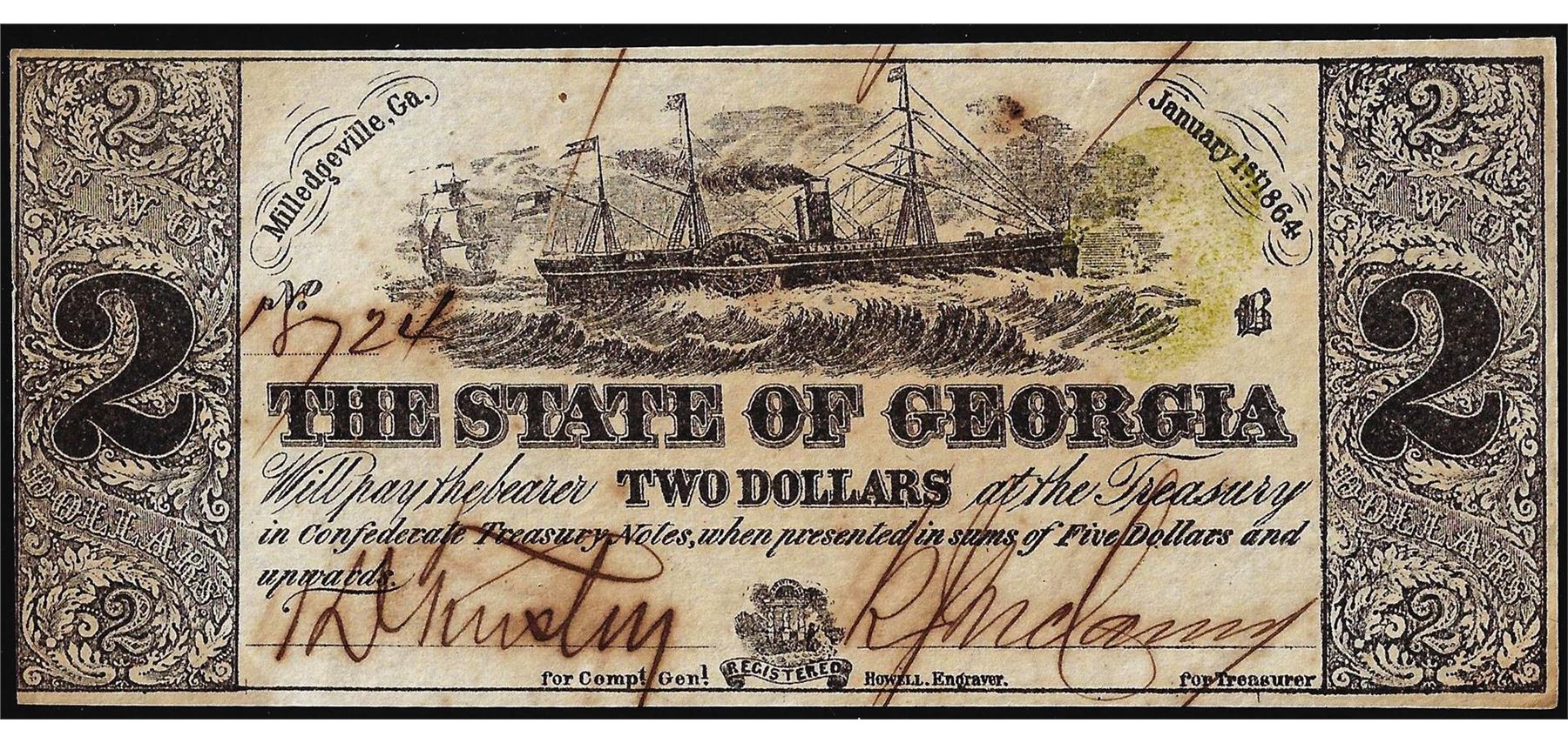 One 1864 $2 The State of Georgia Milledgeville Obsolete Note.