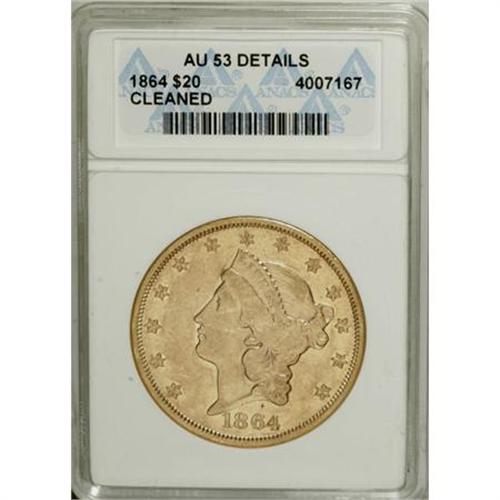 <B>1864 $20 --Cleaned--ANACS. AU53 Details.</B></I> Considerable luster brightens protected areas, particularly on the reverse. An impressively detailed representative of this scarce Civil War Philadelphia Mint issue.<BR><BR><B>Coin Engraver:</B> James B. Longacre<BR><BR><b>Shipping:</b> Coins & Currency (<a target="_blank" href="http://www.heritageauctions.com/common/shipping.php">view shipping information</a>)