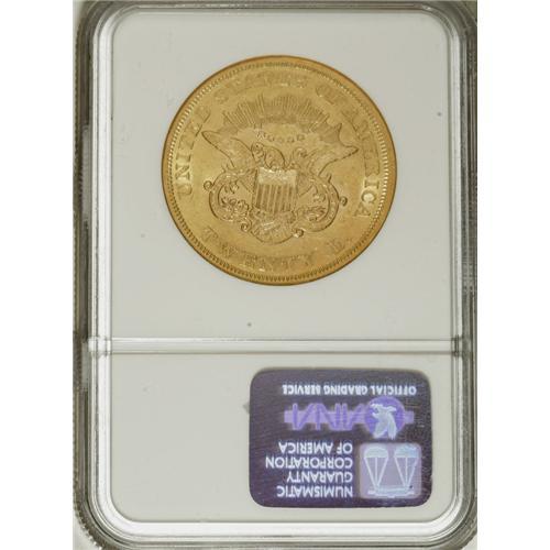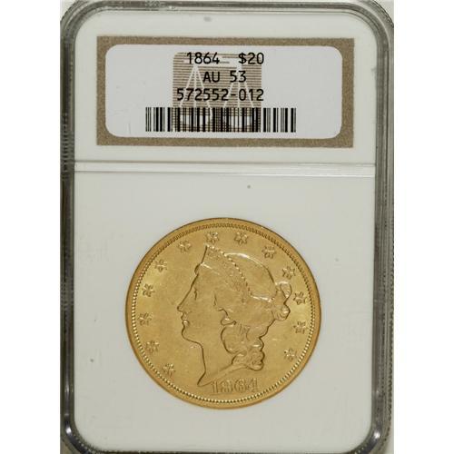 <B>1864 $20 AU53 NGC.</B></I> This is a remarkably distraction-free piece from this Civil War-era issue, with extremely lustrous yellow-gold surfaces, a decent strike, and only trivial, grade-consistent abrasions. A scarce issue in all grades.<BR><BR><b>Shipping:</b> Coins & Currency (<a target="_blank" href="http://www.heritageauctions.com/common/shipping.php">view shipping information</a>)