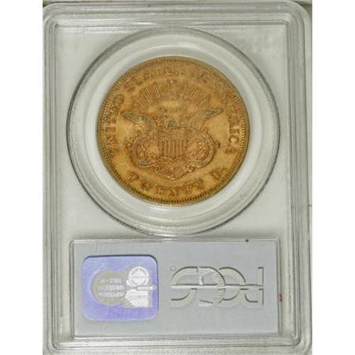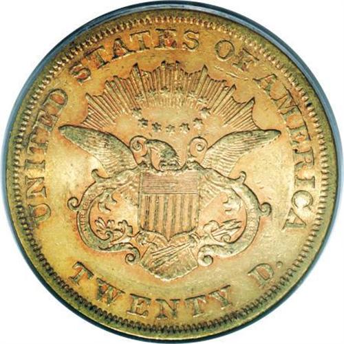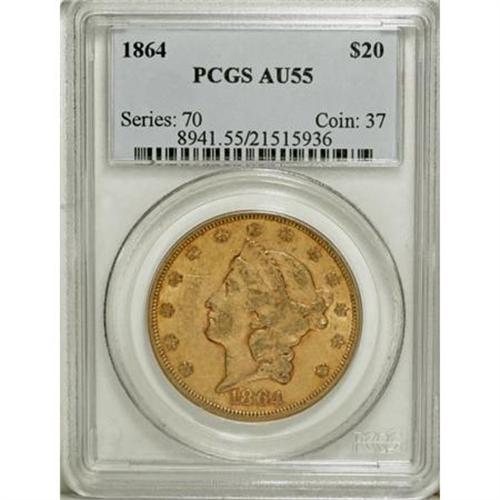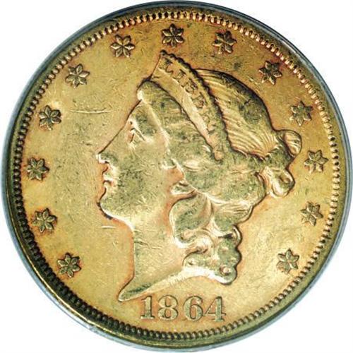 <B>1864 $20 AU55 PCGS.</B></I> Apricot coloration with deeper orange hues in the recessed areas of the devices. A couple of shallow field scratches, one below Liberty's chin, and the other above the nose, are the only distracting marks on this otherwise attractive coin. Only slightly more than 200,000 pieces were struck, since gold coins did not circulate except in the West, and examples were only required infrequently for export. Population: 27 in 55, 39 finer (11/07). <BR><BR><B>Coin Engraver:</B> James B. Longacre<BR><BR><b>Shipping:</b> Coins & Currency (<a target="_blank" href="http://www.heritageauctions.com/common/shipping.php">view shipping information</a>)