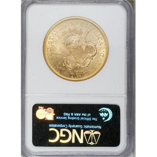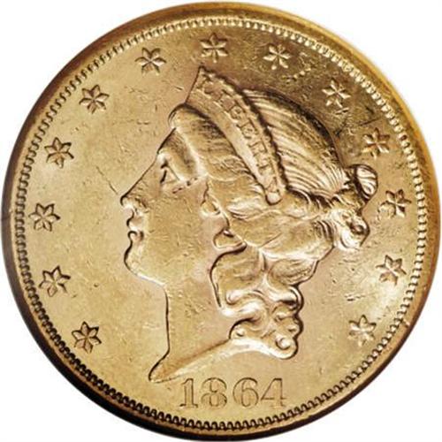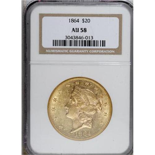 <B>1864 $20 AU58 NGC.</B></I> A pleasing example of this Civil War issue, which Garrett and Guth (2006) describe as "scarce in all grades." This well struck piece offers excellent luster, and the wheat-tinged yellow-gold surfaces show only a hint of friction on the well struck, moderately abraded devices. NGC has graded only eight finer examples (9/07).<BR><BR><B>Coin Engraver:</B> James B. Longacre<BR><BR><b>Shipping:</b> Coins & Currency (<a target="_blank" href="http://www.heritageauctions.com/common/shipping.php">view shipping information</a>)