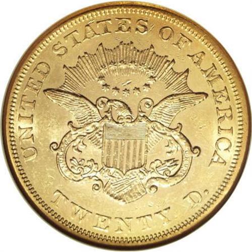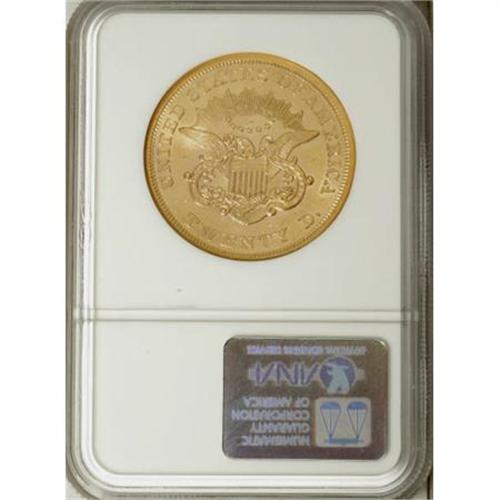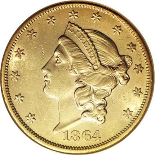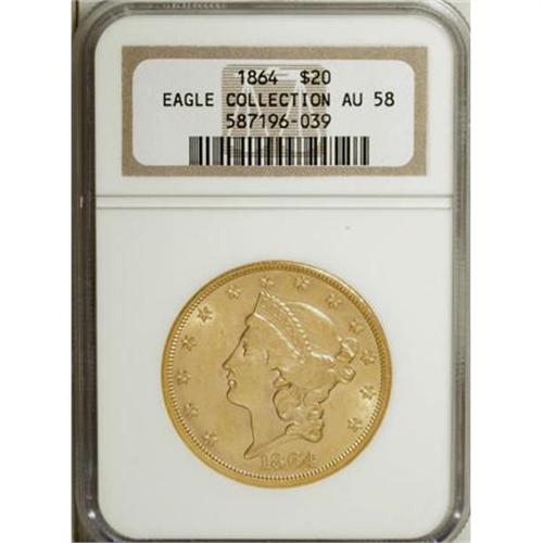 <B>1864 $20 AU58 NGC.</B></I> Ex: Eagle Collection. A vibrant yellow-gold piece with subtle hints of lemon and green-gold in the shining fields. While Liberty's portrait shows slight softness overall, only a trace of friction is visible. Light abrasions overall, with the most significant mark appearing to the left of Liberty's nose. NGC has graded a mere eight finer examples of this low-mintage Civil War-era issue (3/08).<BR><BR><B>Coin Engraver:</B> James B. Longacre<BR><BR><b>Shipping:</b> Coins & Currency (<a target="_blank" href="http://www.heritageauctions.com/common/shipping.php">view shipping information</a>)