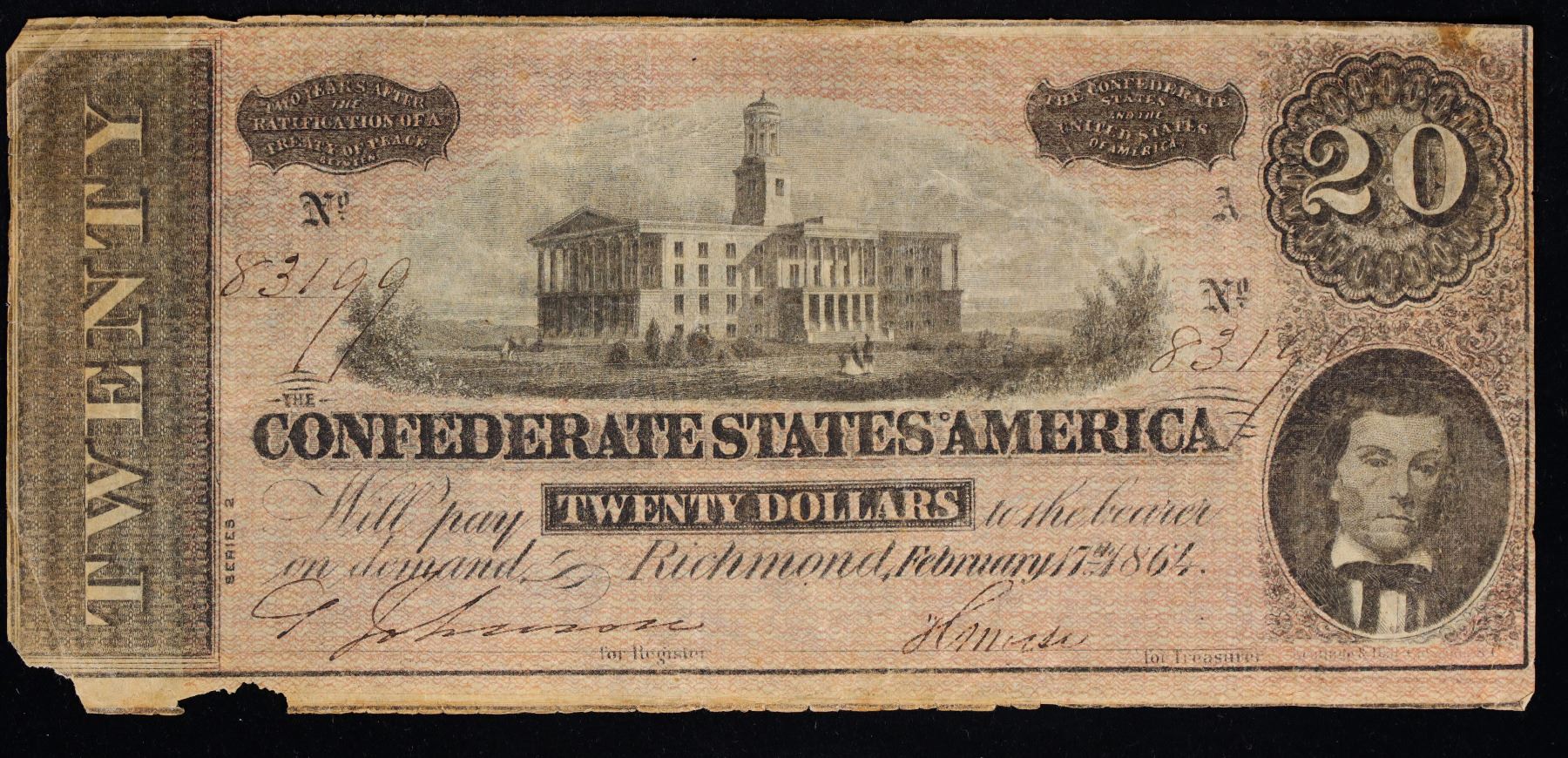1864 $20 Confederate Note, T-67 CSA Grades xf details. The legacy of the Civil War lives on! Issued over a century ago, these amazing 1864 $20 notes in Circulated condition are from the seventh and last issue of Confederate currency. Measuring approximately 7" x 3", each displays the state capital of Nashville, Tennessee and a portrait of Confederate vice president A.H. Stephens on the face.