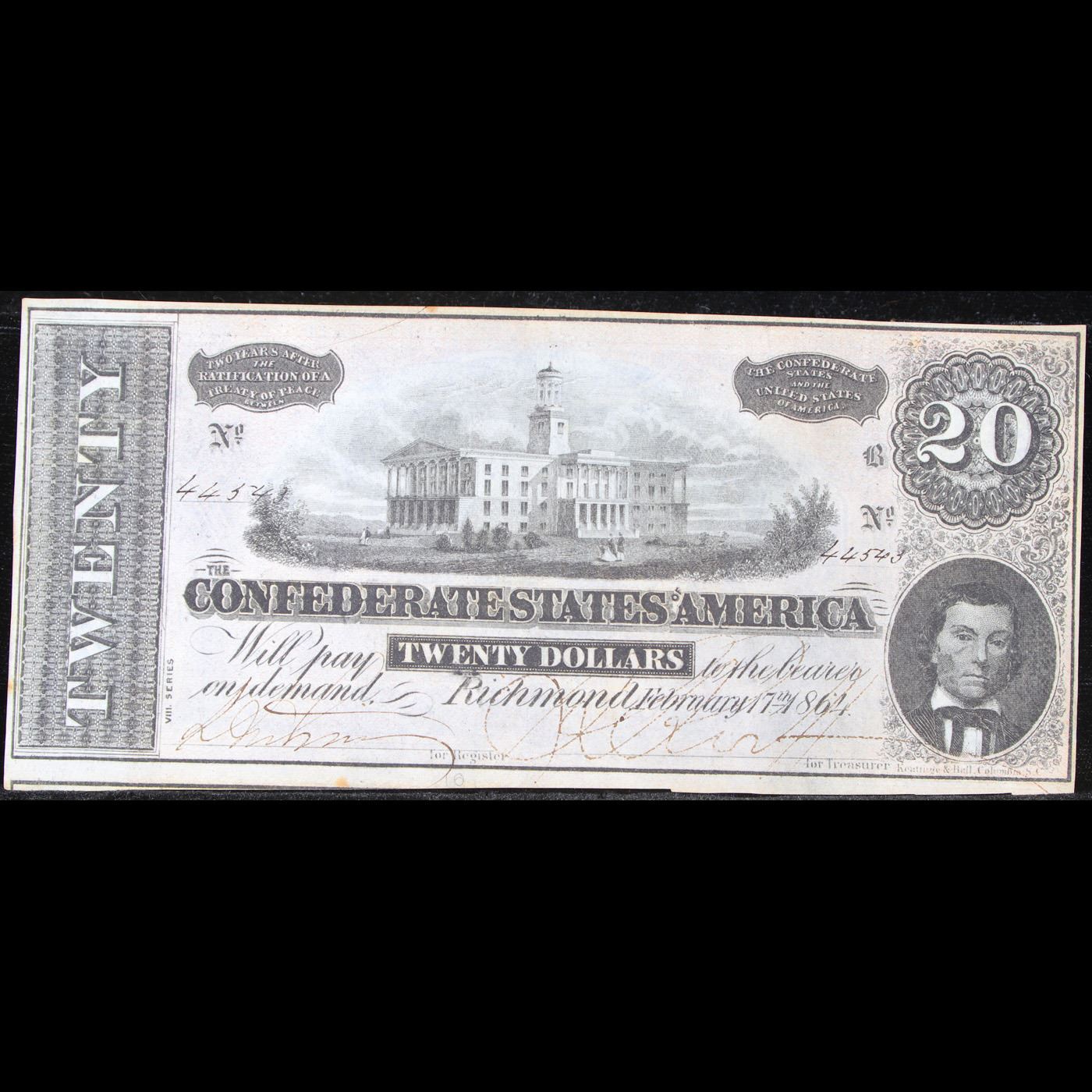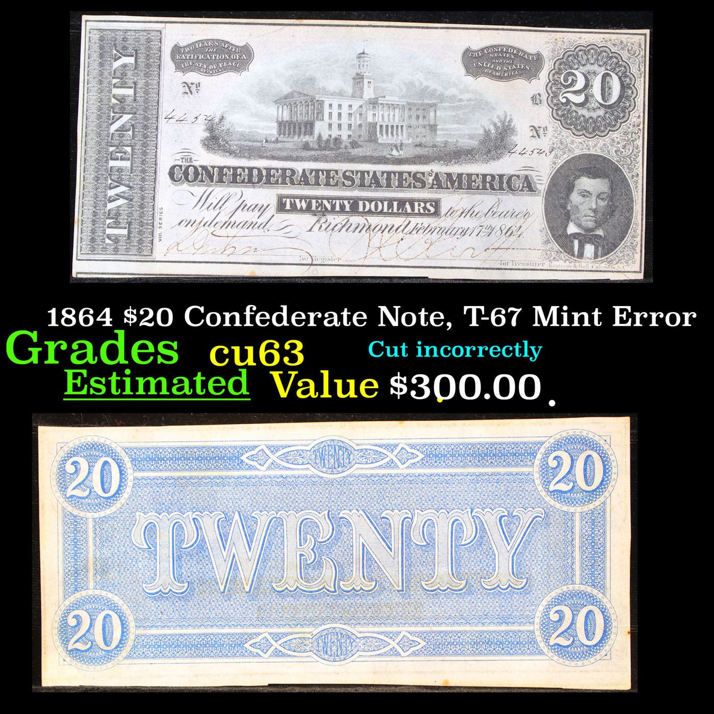 1864 $20 Confederate Note, T-67 Mint Error Grades Select CU