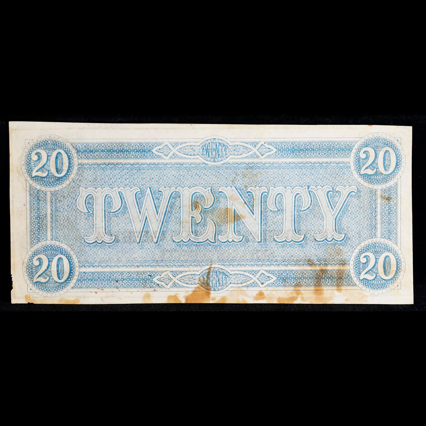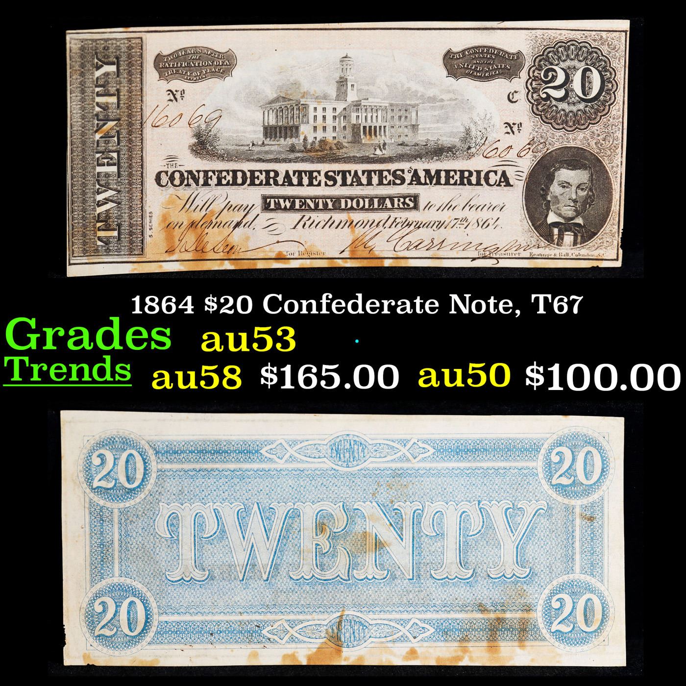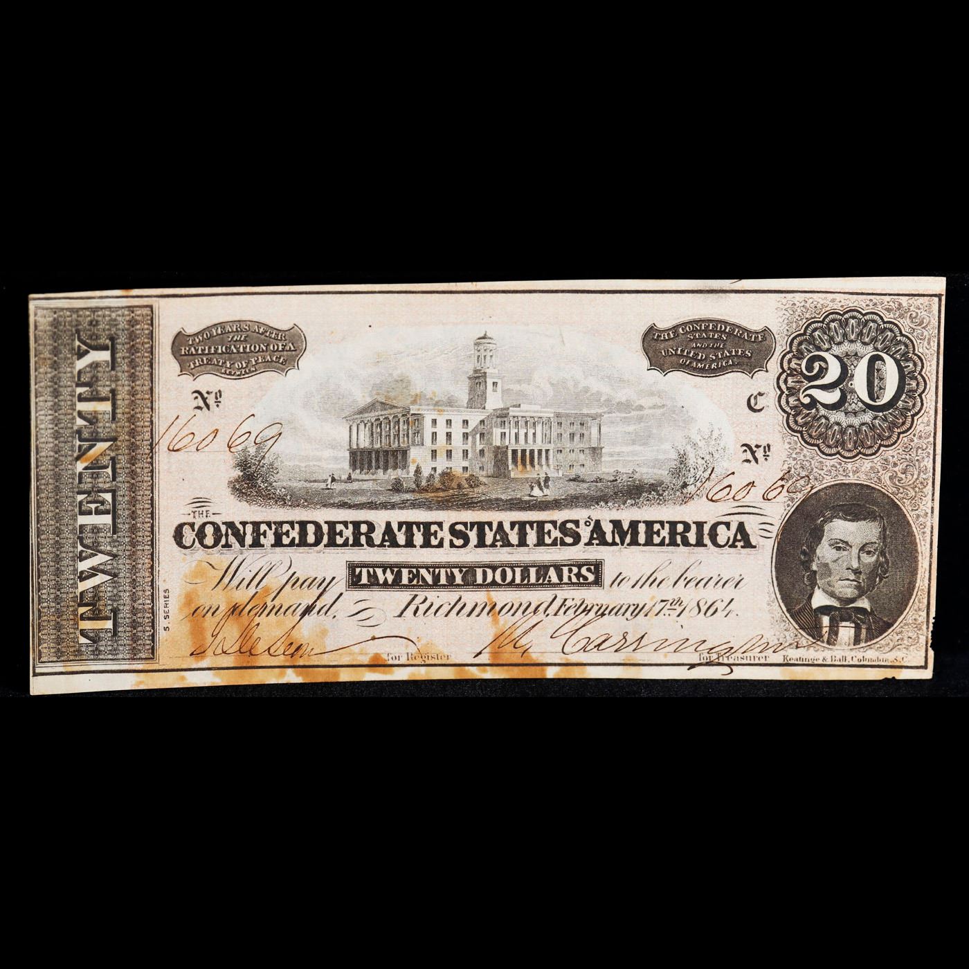 1864 $20 Confederate Note, T67 Grades Select AU. Of great historical interest this is the last $10 currency notes issued by the Confederate States of America. The 7th and last issue of Confederate notes. Notes hand signed and numbered by Confederate soldiers and families. Printed and issued over 140 years ago during the Civil War. Depicts Confederate cabinet member Robert M. T. Hunter and features a detailed vignette of horse-drawn artillery. This large 7" x 3" Confederate $10 note is a genuine keepsake from one of the most significant periods in American history.