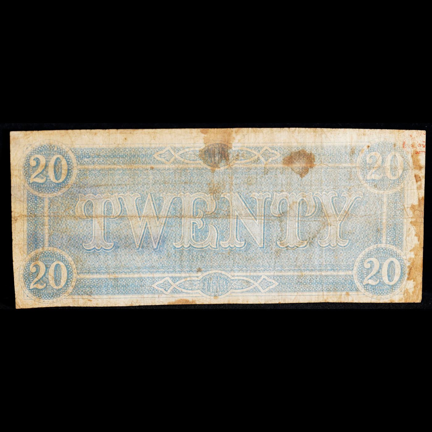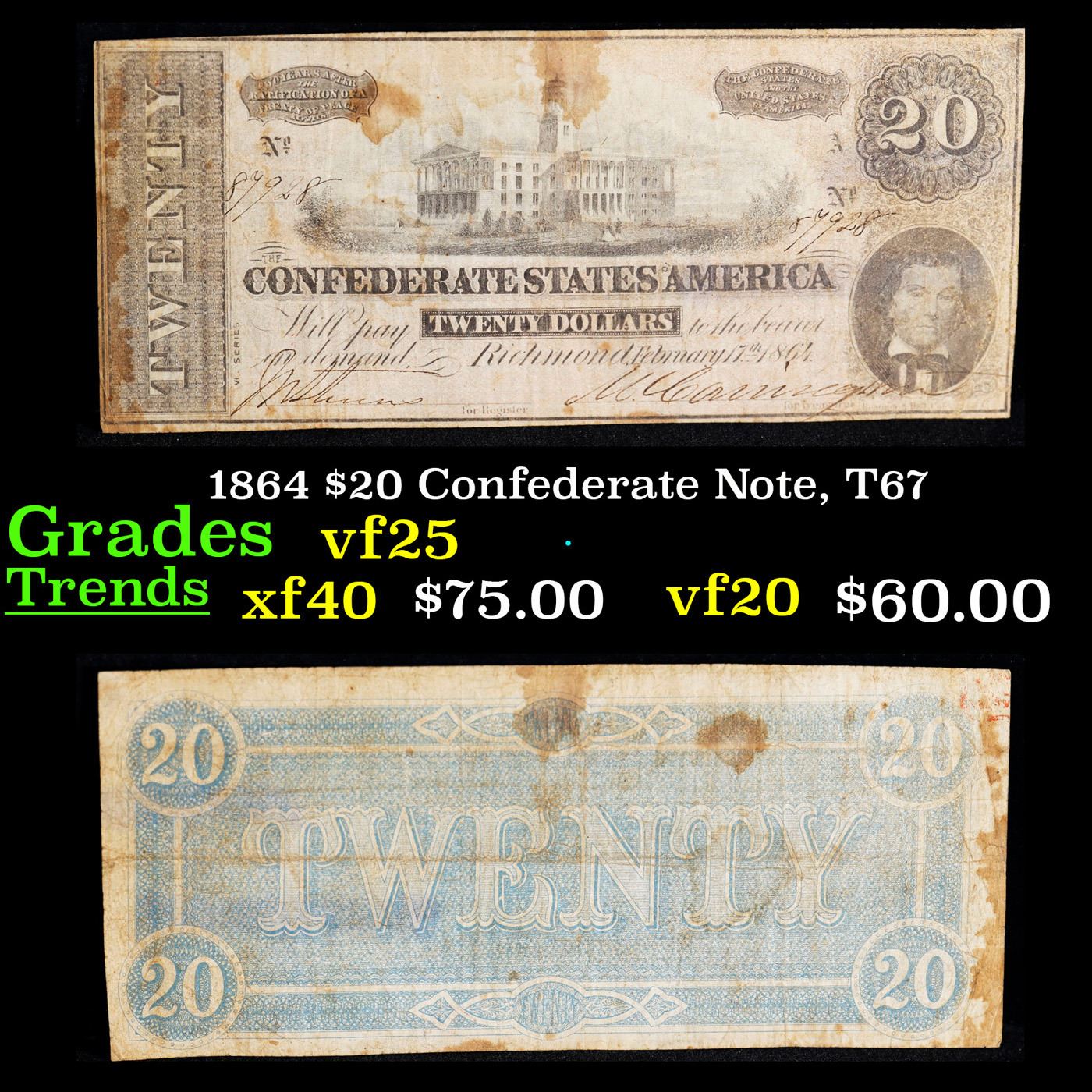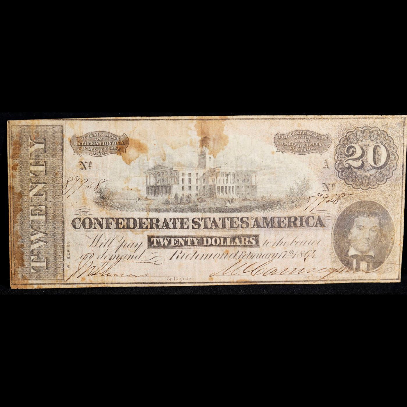 1864 $20 Confederate Note, T67 Grades vf+. Of great historical interest this is the last $10 currency notes issued by the Confederate States of America. The 7th and last issue of Confederate notes. Notes hand signed and numbered by Confederate soldiers and families. Printed and issued over 140 years ago during the Civil War. Depicts Confederate cabinet member Robert M. T. Hunter and features a detailed vignette of horse-drawn artillery. This large 7" x 3" Confederate $10 note is a genuine keepsake from one of the most significant periods in American history.