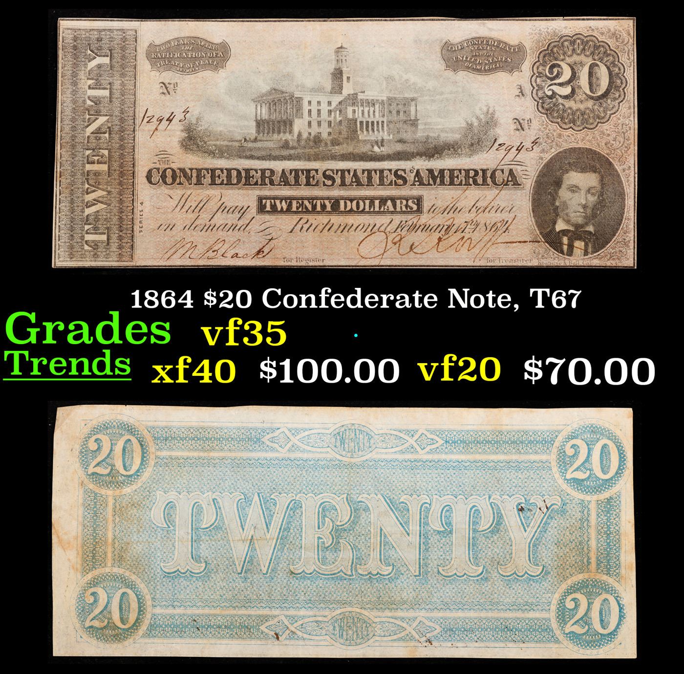 1864 $20 Confederate Note, T67 Grades vf++. The legacy of the Civil War lives on! Issued over a century ago, these amazing 1864 $20 notes in Circulated condition are from the seventh and last issue of Confederate currency. Measuring approximately 7" x 3", each displays the state capital of Nashville, Tennessee and a portrait of Confederate vice president A.H. Stephens on the face.