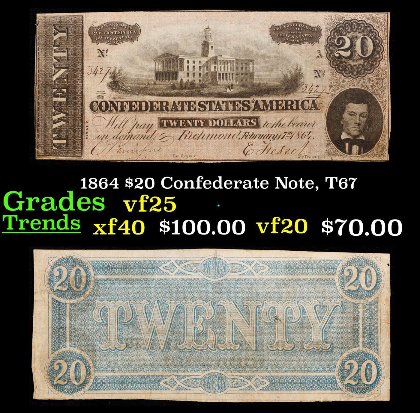 1864 $20 Confederate Note, T67 Grades vf+. The legacy of the Civil War lives on! Issued over a century ago, these amazing 1864 $20 notes in Circulated condition are from the seventh and last issue of Confederate currency. Measuring approximately 7" x 3", each displays the state capital of Nashville, Tennessee and a portrait of Confederate vice president A.H. Stephens on the face.