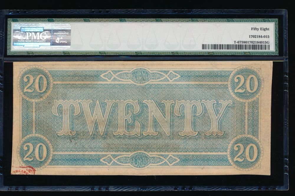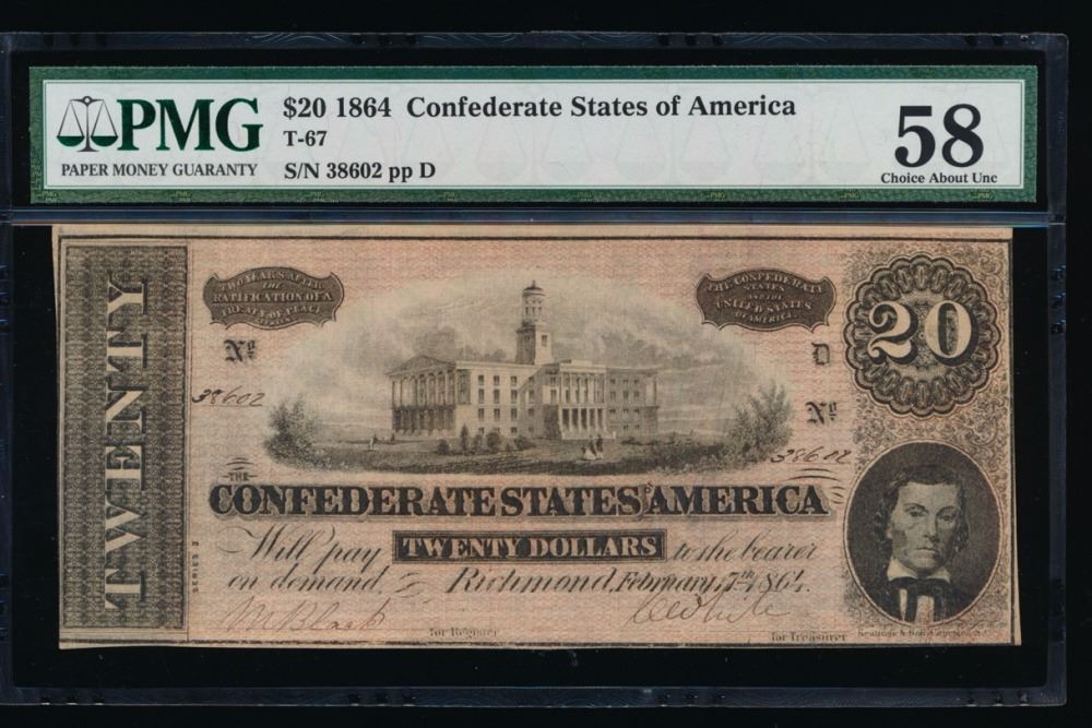 One 1864 $20 Confederate Sates of America Note PMG 58.