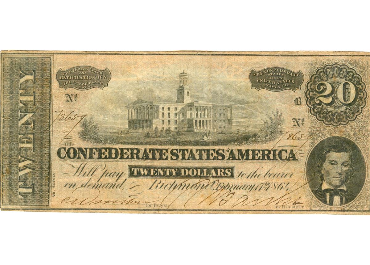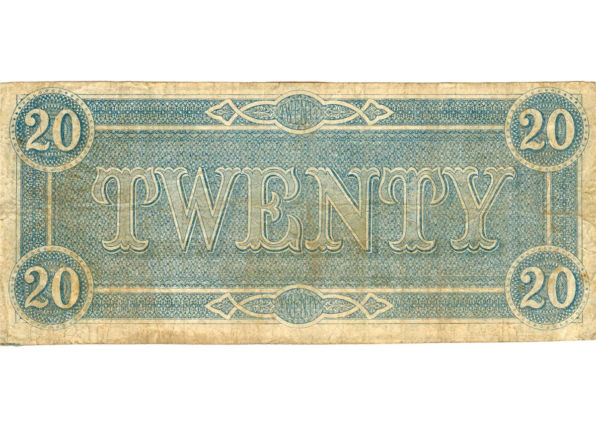 One 1864 $20 Confederate States of America Bank Note. Origin: Richmond, Virginia.