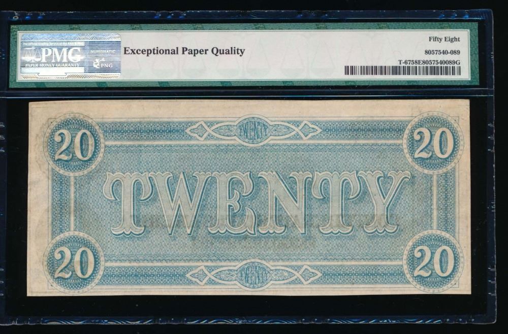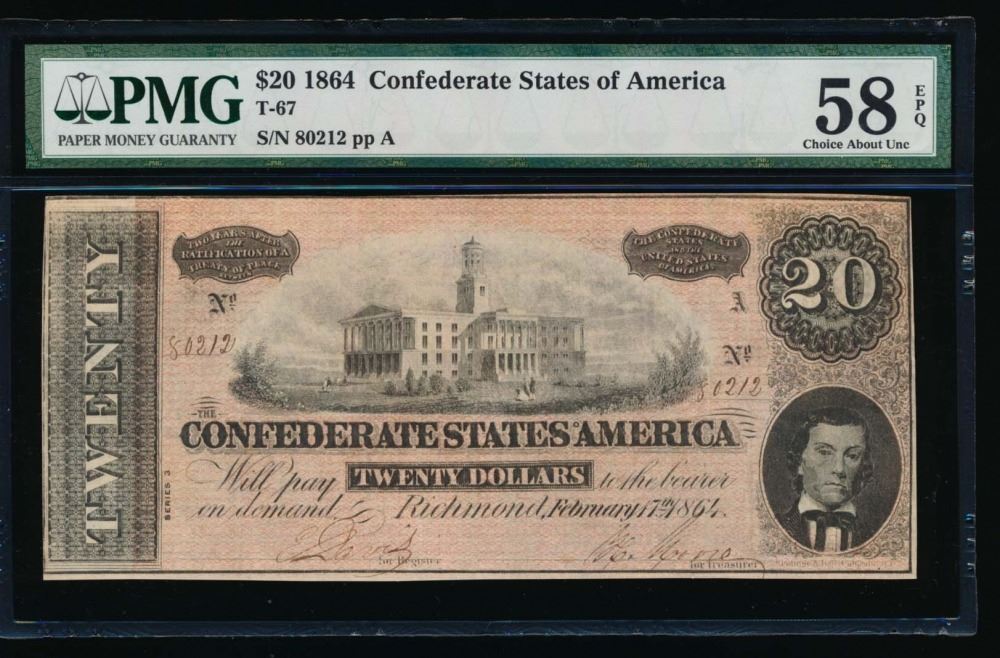 One 1864 $20 Confederate States of America Note PCGS 58EPQ.