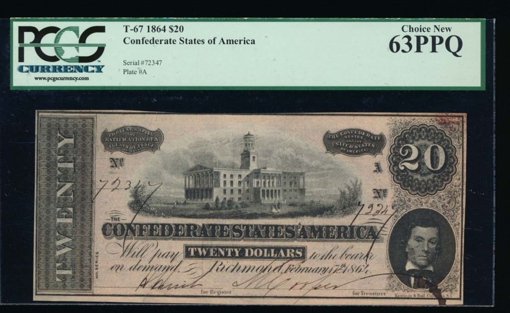 One 1864 $20 Confederate States of America Note PCGS 63PPQ.