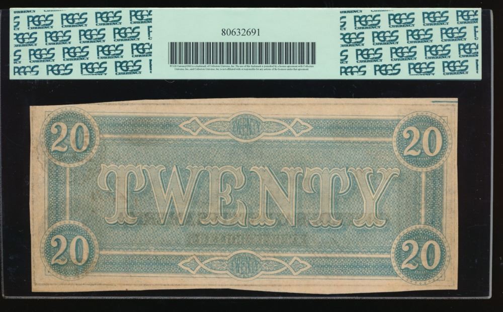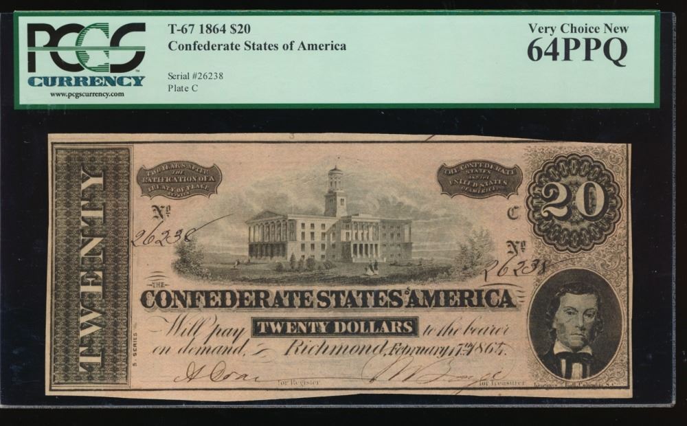 One 1864 $20 Confederate States of America Note PCGS 64PPQ.