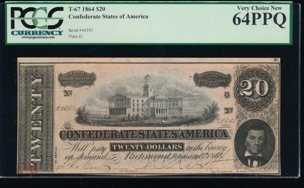 One 1864 $20 Confederate States of America Note PCGS 64PPQ.