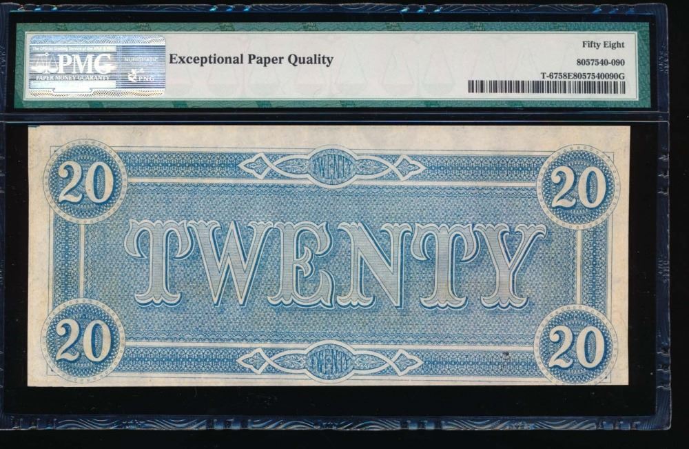 One 1864 $20 Confederate States of America Note PMG 58EPQ.
