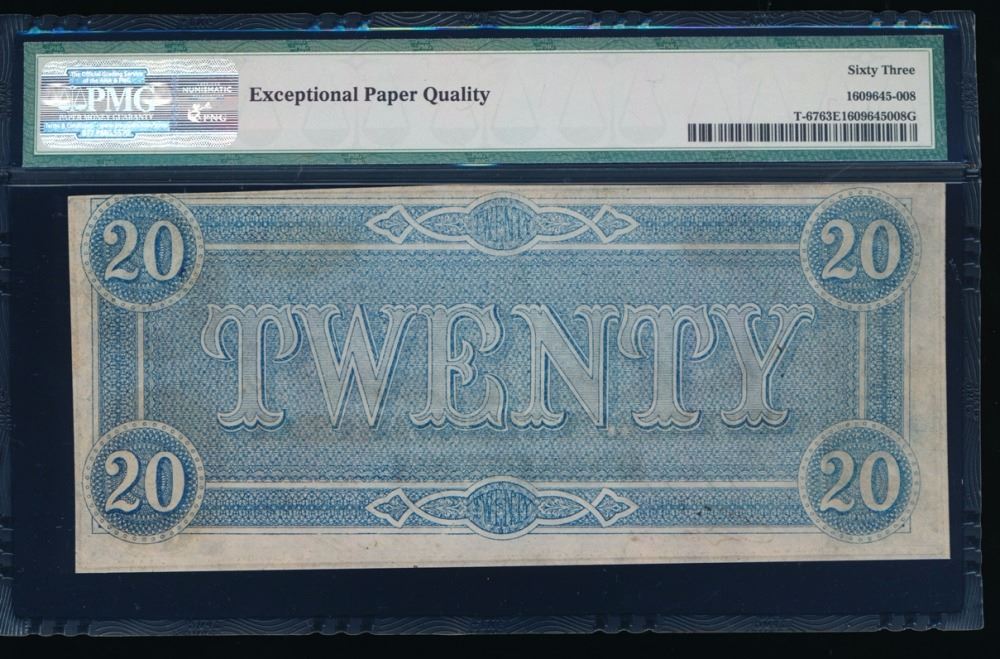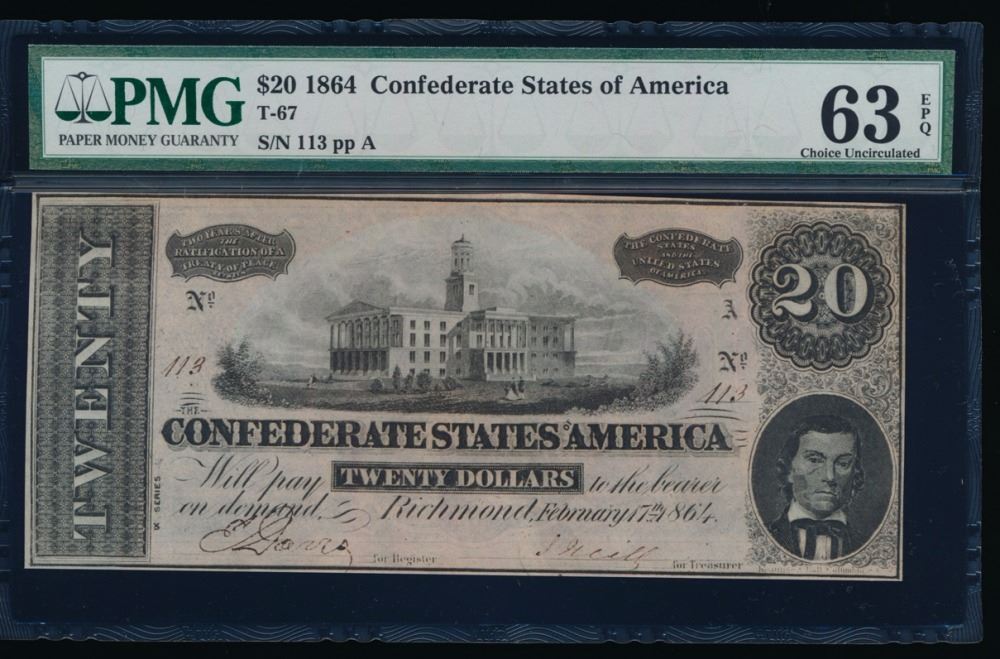 One 1864 $20 Confederate States of America Note PMG 63EPQ.