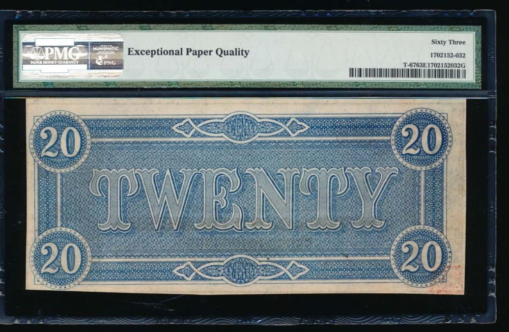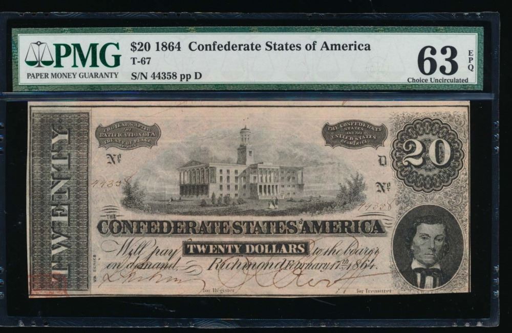 One 1864 $20 Confederate States of America Note PMG 63EPQ.