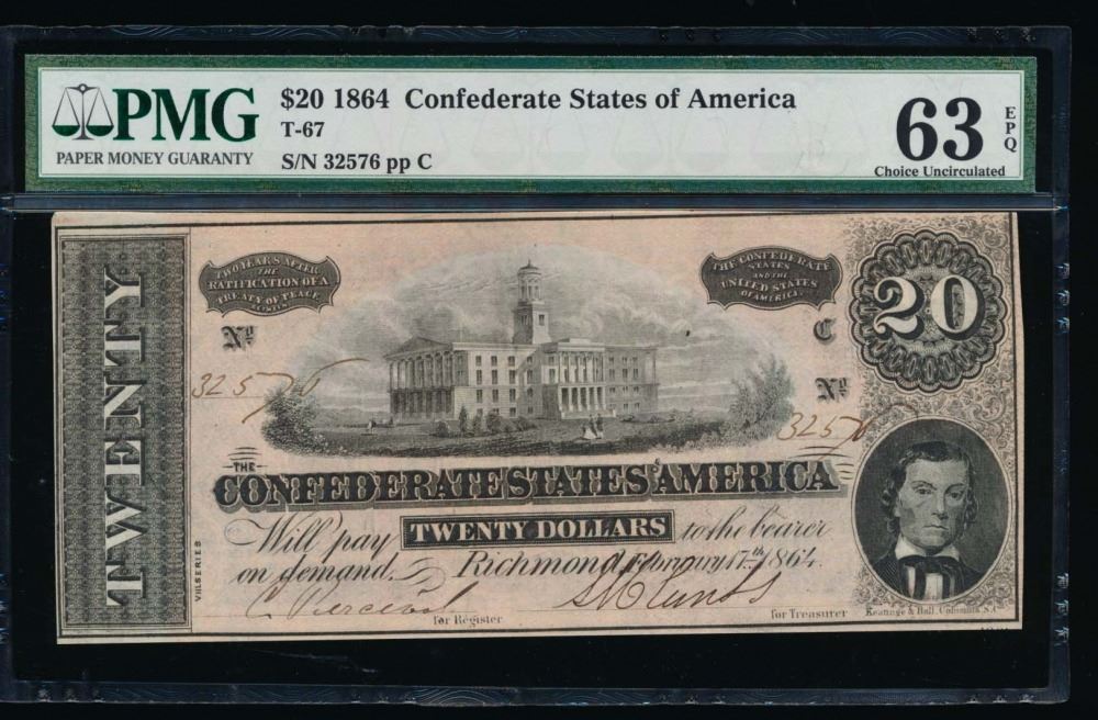 One 1864 $20 Confederate States of America Note PMG 63EPQ.