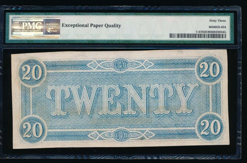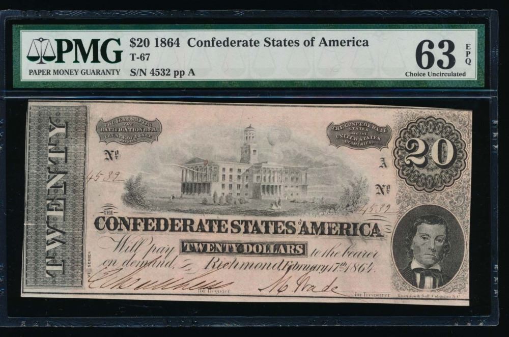 One 1864 $20 Confederate States of America Note PMG 63EPQ.
