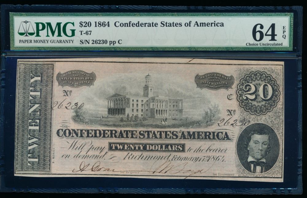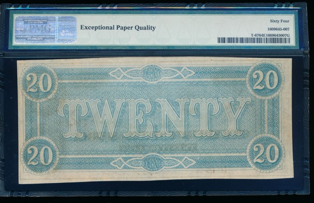 One 1864 $20 Confederate States of America Note PMG 64EPQ.