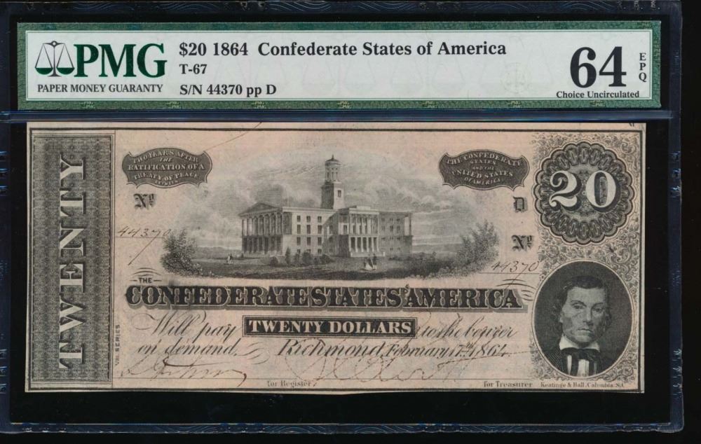 One 1864 $20 Confederate States of America Note PMG 64EPQ.