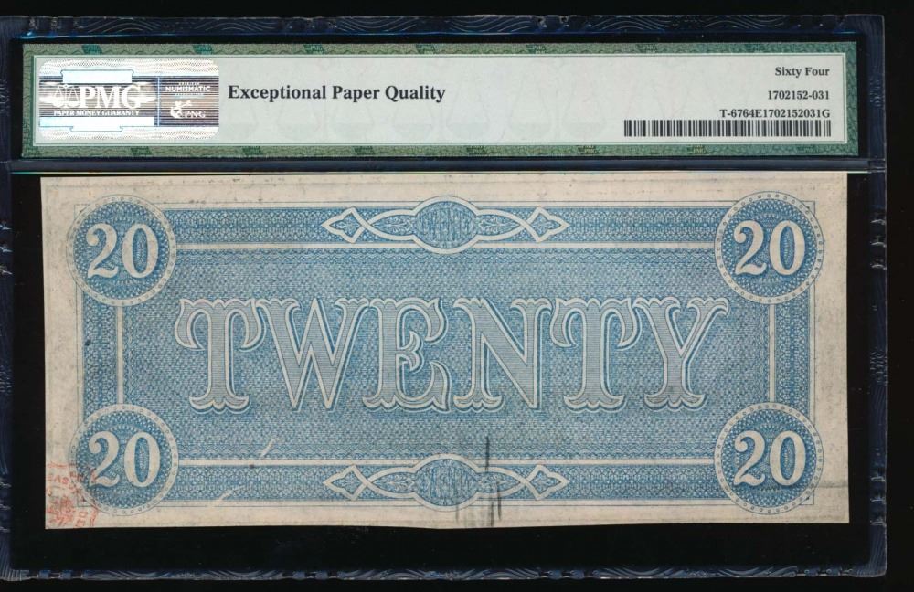 One 1864 $20 Confederate States of America Note PMG 64EPQ.