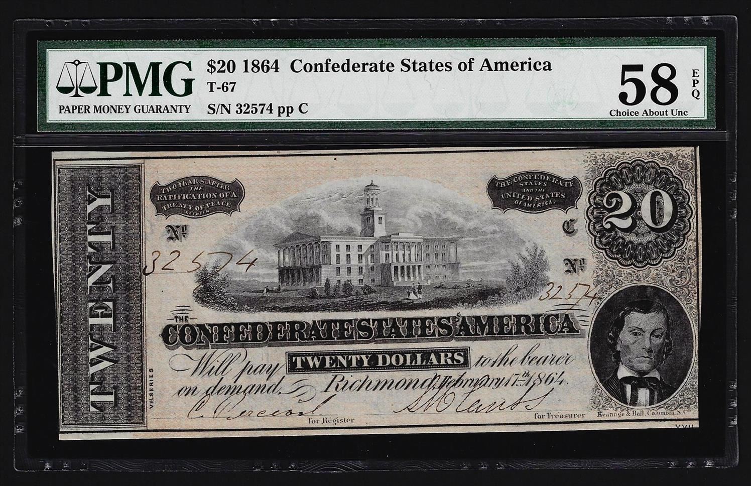 One 1864 $20 Confederate States of America Note PMG Choice About Uncirculated 58EPQ. PMG Certified.