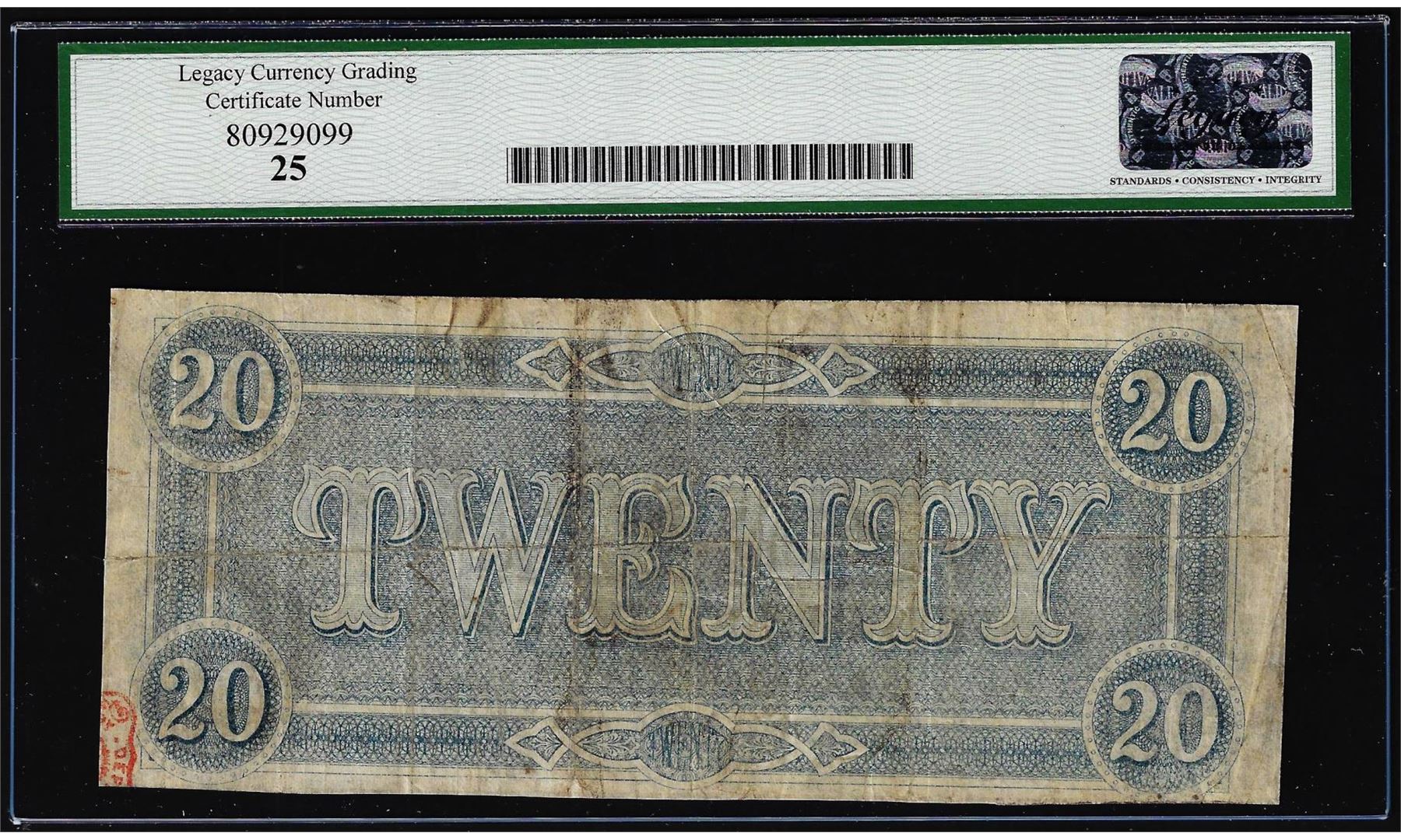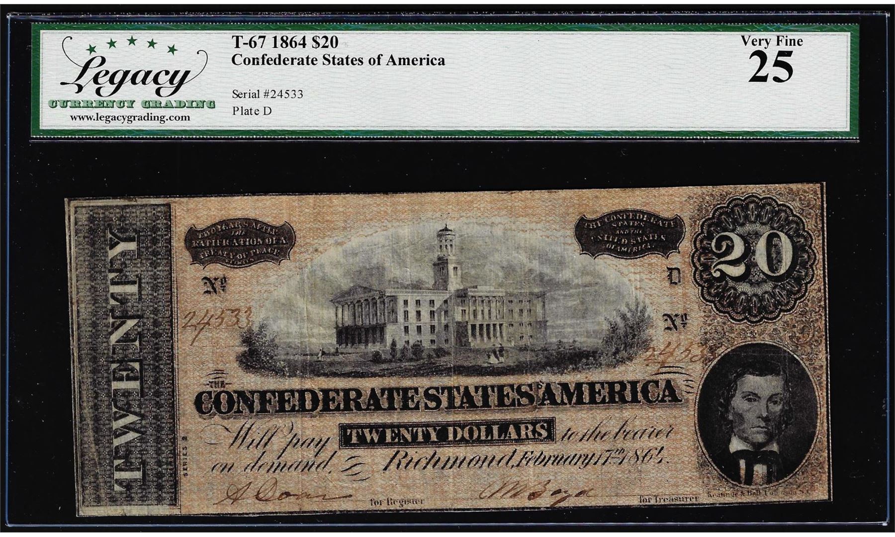 One 1864 $20 Confederate States of America Note T-67 Legacy Very Fine 25. Legacy Graded.