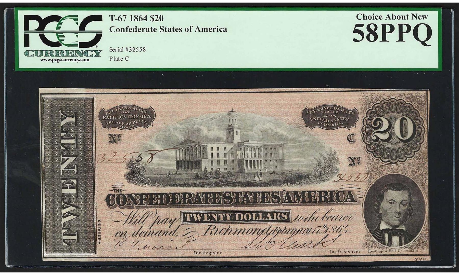 One 1864 $20 Confederate States of America Note T-67 PCGS Choice About New 58PPQ. PCGS Graded.