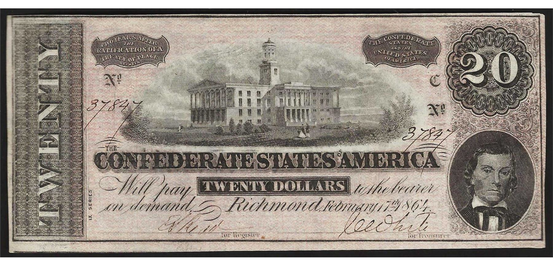 One 1864 $20 Confederate States of America Note.