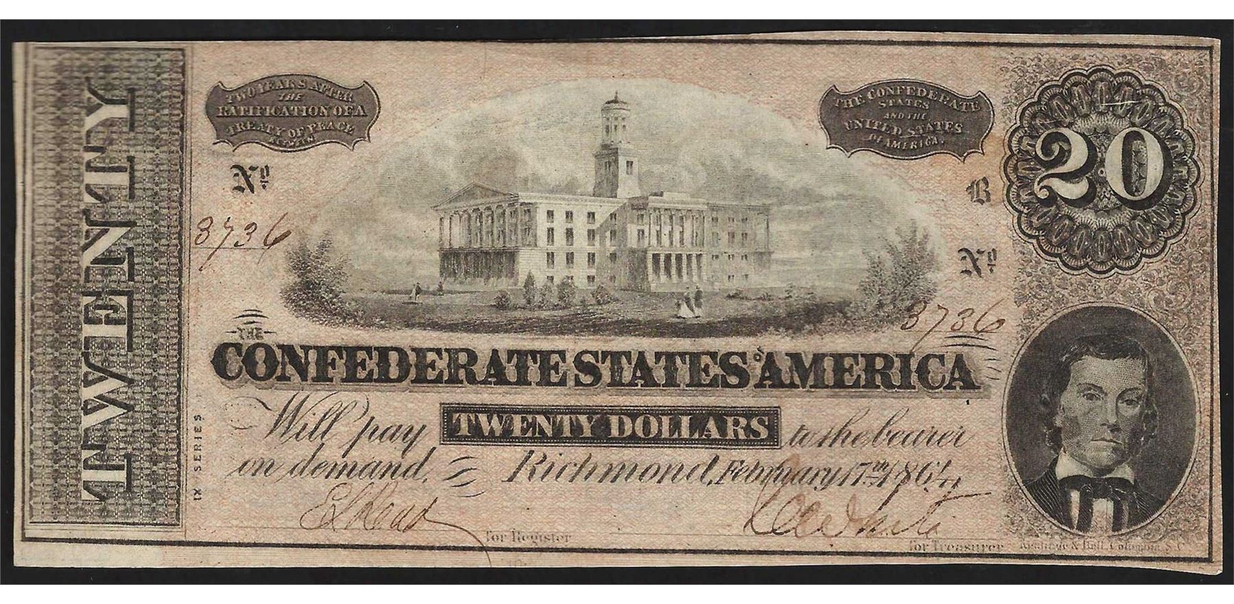One 1864 $20 Confederate States of America Note.