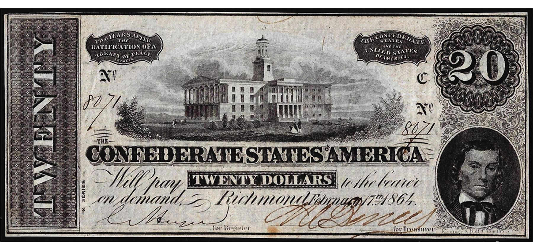 One 1864 $20 Confederate States of America Note.