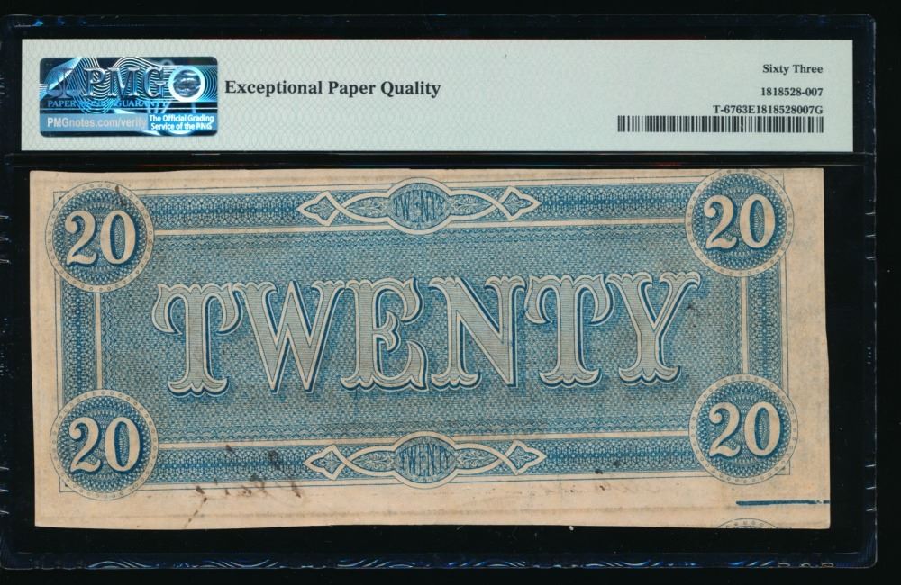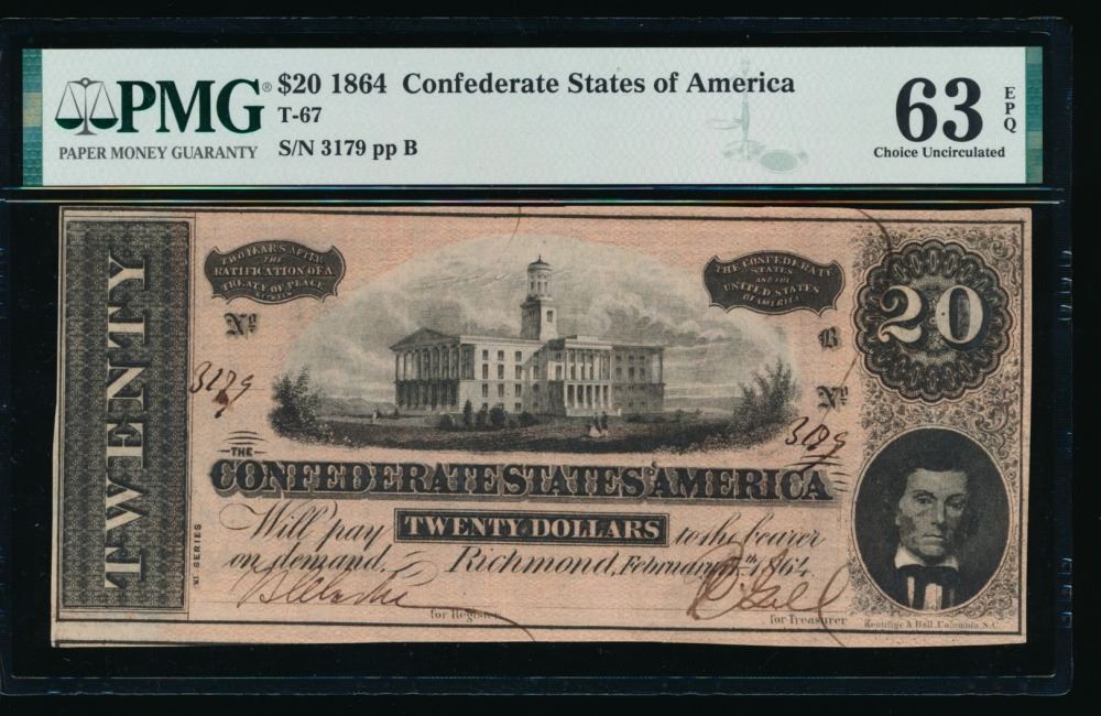 One 1864 $20 Confederate States of America T-67 PMG 63EPQ.