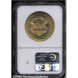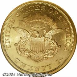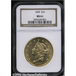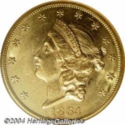 <B>1864<$20> MS61 NGC.</B></I> A well struck piece that exhibits extensive bright luster and has a surprisingly unabraded reverse. A graze on Liberty's jaw is of interest primarily as a pedigree marker. Gold coins did not circulate in the East during the Civil War, and most of the production of 204,235 pieces was presumably exported overseas and eventually melted. While the 1864 Double Eagle is merely scarce in XF and AU grades, it is very rare in Mint State. NGC has only graded three examples as such, one piece as MS60 and two as MS61. Only four pieces have been certified Mint State by PCGS, one as MS60, two as MS61, and a solitary MS62 example. This lot offers an exceptionally rare opportunity to obtain an Uncirculated 1864 Twenty, which would be a standout in any advanced collection of this challenging denomination. <BR><BR><B>Important notice:</B> Heritage usually auctions material at the rate of 200-250 lots per hour. On some occasions eBay Live bid software or the Internet may not be able to keep up with the pace of the auction. We recommend placing a realistic absentee bid now as insurance to avoid disappointment. Occasionally the auctioneer may eliminate or reject an eBay Live bid, and the auctioneer may also reopen a lot after the close of the eBay live bidding (usually because we missed an audience bid), and may reject your bid even if it shows you as the winning bidder. By bidding via eBay Live, you agree that Heritage may award the lot to another bidder at its sole discretion under the circumstances described above or any other reasonable circumstances. Since eBay bids are not shown to us until we open the lot on the floor, we treat those bids just like floor bids. In most cases the floor responds before the eBay bid is presented to us, due to Internet lag time, so for consistency we have made it a policy that floor bids are always considered first over tie eBay live bids. Also please note that all Heritage lots purchased through eBay Live carry a 20% Buyer's Premium. Please make sure you read the Terms and Conditions before you bid. </span></font></tr></table></td></tr></table>