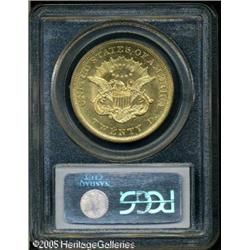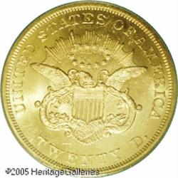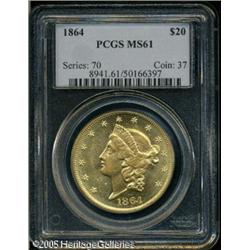 <B>1864 $20 MS61 PCGS.</B></I> Nearly every 1864 Double Eagle that survived from the original mintage of 204,235 coins is a circulated example. Those Mint State coins that are known are apt to be in the lowest levels. Only seven finer examples have been certified by PCGS, and everyone of those is just MS62. Population: 10 in 61, 7 finer (1/05). Lot:9012