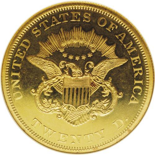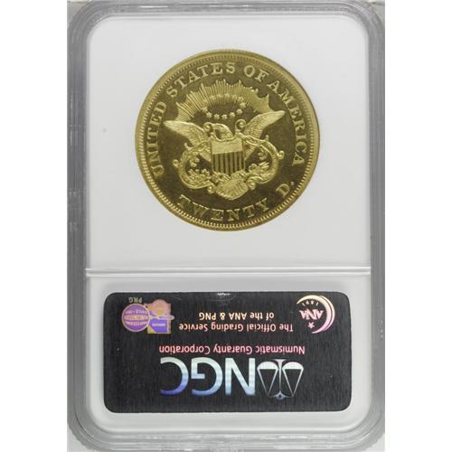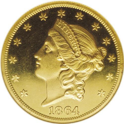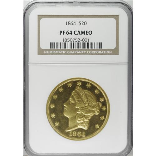 <B>1864 $20 PR64 Cameo NGC.</B></I> In 1858--only one year after the discontinuation of the large cent and half cent created the first (but certainly not the last) numismatic mania in America--the U.S. Mint began publicly offering wholesale proof sets to collectors. Mint records from those early years of public proof production are spotty at best; while some annual figures may be accurate, oftentimes any specimens that went unsold were reconsigned to the melting pot. The mintages of proof Type One double eagles--those produced from 1858 through 1866, without the motto IN GOD WE TRUST--are recorded in the <I>Guide Book</B></I> as ranging from 80 pieces for the 1859 (the 1858 mintage is unknown) down to 25 pieces for the 1865. Those mintage figures, which are in line with those in the Breen <I>Proof Encyclopedia,</B></I> are largely meaningless in terms of the surviving population, however, and the population data are not particularly helpful, either. Like so many rare coins where a one-point increment in grade can mean potentially huge price increases, the Type One double eagle certified populations are artificially swollen by multiple resubmissions, crossovers, and "crack-outs."<BR> For what they are worth, here are the present population data: NGC has graded a total of 15 proof 1864s, including two Cameo coins in PR63 and nine PR64 Cameos, and four Ultra Cameo pieces, two PR64s, one PR65 S, and one PR67 piece. This latter PR67 Ultra Cameo is the finest known at either service. PCGS has graded a total of five coins, all PR64s, including three graded PR64 Cameo, with none finer. So the number of <I>submission events</B></I> at both services for this issue totals 20 pieces. In 1977 the Breen <I>Proof Encyclopedia,</B></I> calling this the rarest proof gold denomination of 1864, enumerated nine or 10 different coins. More recently, the authors of the Garrett-Guth <I>Gold Encyclopedia</B></I> noted that, "Despite the fact that only 12 to 15 examples of the Proof 1864 double eagle are known, it is probably the most available year for the type in the Proof format." Given our estimates based on the available data it appears that those numbers might be a bit on the high side, but suffice it to say that the number of <I>different coins</B></I> certified is certainly not over the midteens, and possibly as low as 10 pieces.<BR> The proof 1864 double eagle has the date slanting downward slightly from left to right, with the 4 closer to the dentils than the 1. The largest space is between 86 and then between 18, with the 64 quite close together. The left serif of the 1 is slightly right of the center of a dentil, and the right base of the 4 is nearly to the right edge of a dentil. There are scattered die rust marks near the eye, the brow, and below LIBER. We also see on this piece a short, squiggly die crack at the top of Liberty's forehead, a crack that simulates a bulging vein. The reverse die for this issue was repolished and used again from the 1862-3 proof issues. The present PR64 Cameo specimen shows a bold strike over distraction-free yellow-gold surfaces, with considerable mint frost and good field-device contrast. All star centrils are boldly brought up on this piece, and there are no weak spots apparent in Liberty's highpoint hair. A small copper alloy spot on the reverse, to the right of the shield border, and a second less-noticeable dark area to the left side of the glory of rays, will serve as a future pedigree markers for this delightful Civil War-era piece. Census: 9 in 64 Cameo, 0 finer (11/06).<BR><BR><b>Shipping:</b> Coin/Currency (<a target="_blank" href="http://www.heritageauctions.com/common/shipping.php">view shipping information</a>)