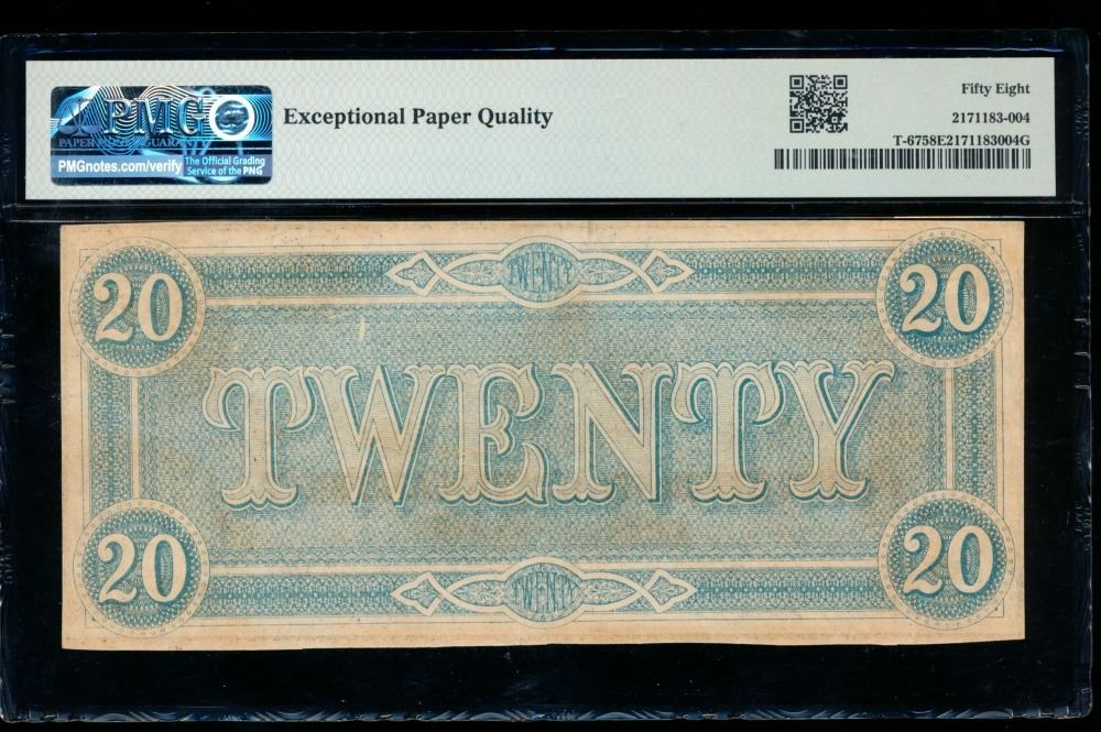 One 1864 $20 T-67 Confederate PMG 58EPQ.