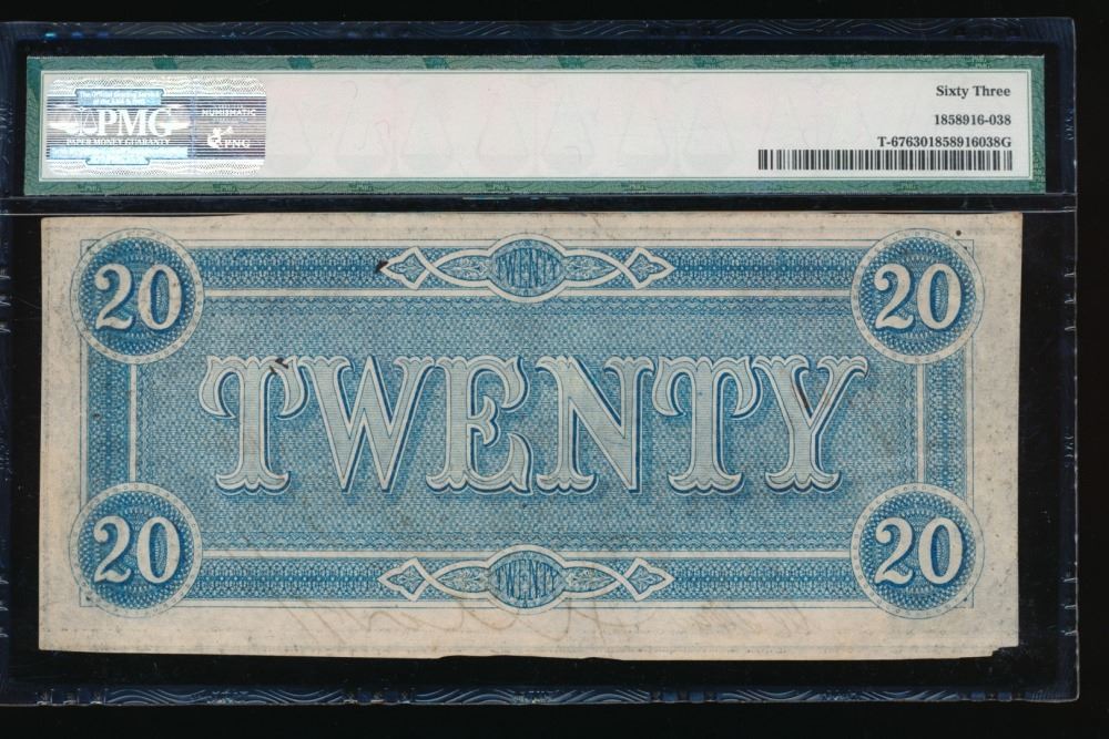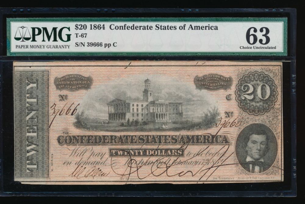One 1864 $20 T-67 Confederate States of America PMG 63.