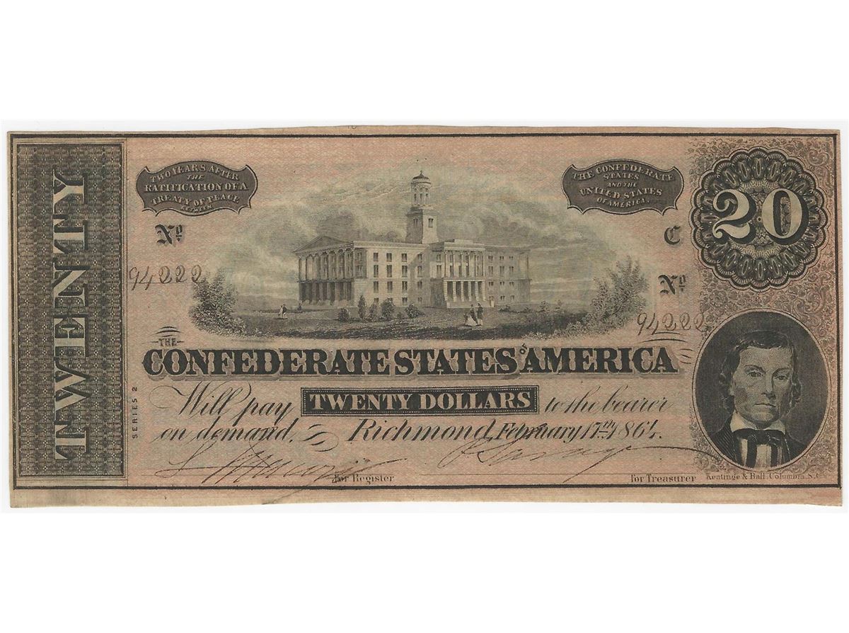 One 1864 $20 The Confederate States of America Note.