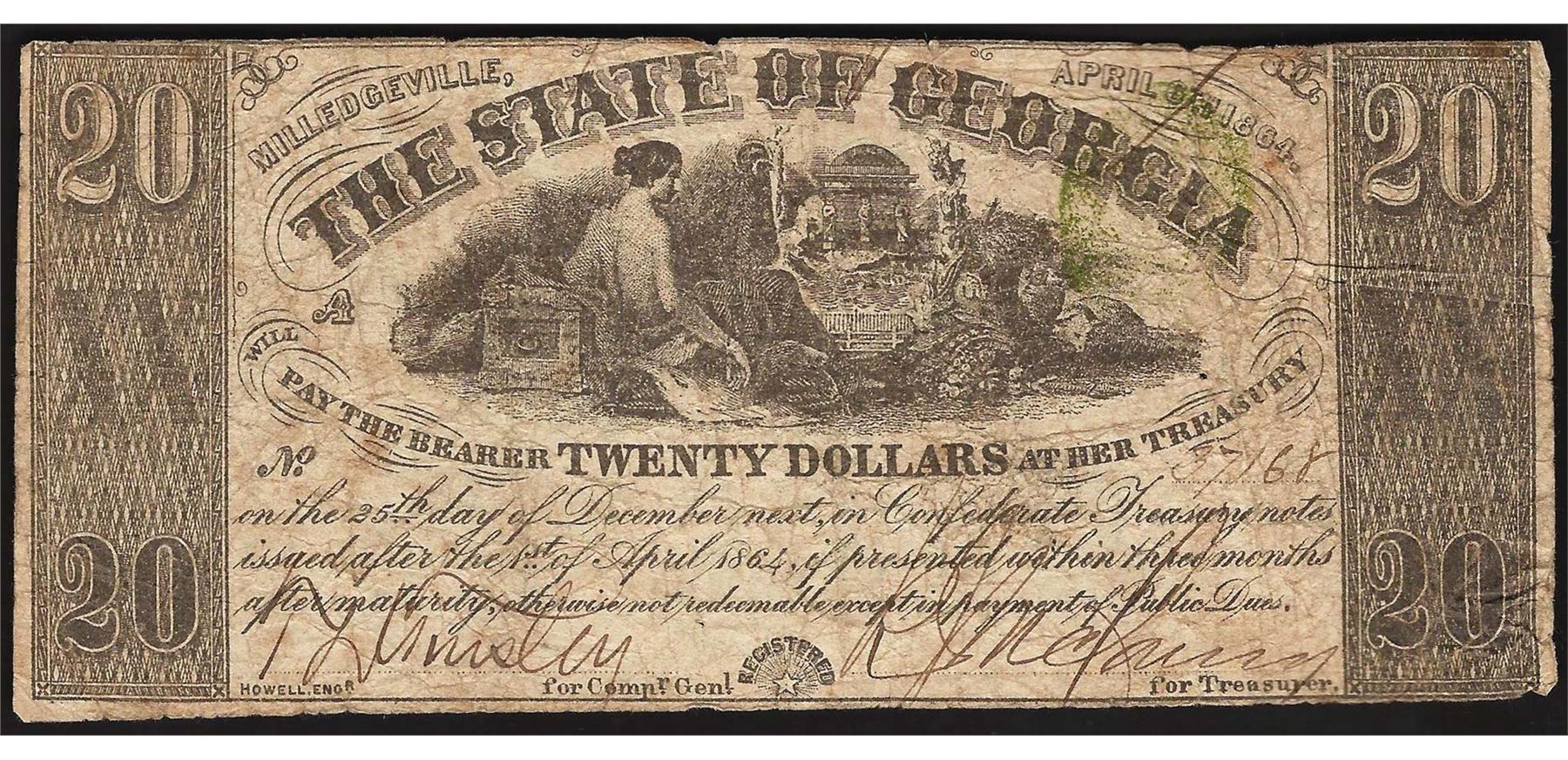 One 1864 $20 The State of Georgia Obsolete Bank Note.