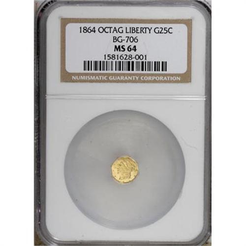 <B>1864 25C Liberty Octagonal 25 Cents, BG-706, High R.5, MS64 NGC.</B></I> An impressive near-Gem with smooth, flashy fields and a consistent strike. Heavy clashed, but void of visible marks. Census: 2 in 64, 2 finer (6/07).<BR><BR><b>Shipping:</b> Coins & Currency (<a target="_blank" href="http://www.heritageauctions.com/common/shipping.php">view shipping information</a>)