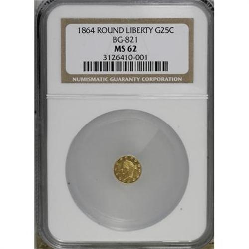 <B>1864 25C Liberty Round 25 Cents, BG-821, Low R.5, MS62 NGC.</B></I> NGC Census: (0/0). PCGS Population (10/3). (#10682)<BR><BR><b>Shipping:</b> Coins & Currency (<a target="_blank" href="http://www.heritageauctions.com/common/shipping.php">view shipping information</a>)